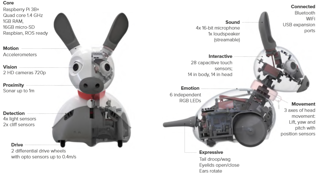 MiRo-E, the friendly but sophisticated, low cost robotic platform is well suited for home learning and research due to its small size. Highly specified, MiRo-E has an expressive face, eyes, ears, and tail, including 43 sensors and 11 degrees of freedom, making it very emotionally engaging. For full technical details, please visit MiRo-E.com.
