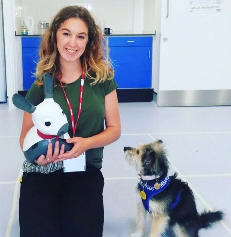 Olivia Barber, first author and PhD student, MiRo-E and the 3 year old therapy dog. (Image taken from the University of Portsmouth).