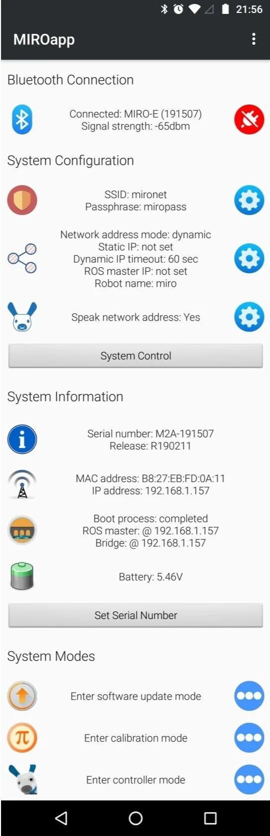 Click on any of the blue ellipsis symbols to enter one of the special system modes. In each case, a dedicated page will open in MiRoApp: the Software update page, Calibration page, or the Controller page (this is the page where demonstrators can review and adjust MiRo's behavioural flags).